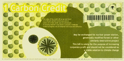 The environmental NGOs have from start been critical of this scheme, as can be seen from the below "Carbon Credit" bill that was distributed at the Kyoto conference of The Hague in 2000.