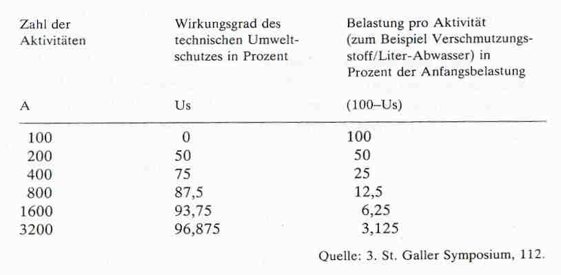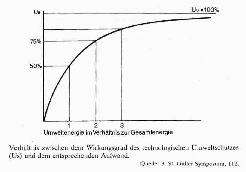 Damit hätten wir alle Faktoren der Produktionsformel zusammengetragen und können ihre Entwicklung abschließen. Das Bestreben einer okologisch fundierten Wirtschaft, die auf Dauer angelegt ist, muß es sein: 1. Die Faktoren E/Z1 + R/Z2 so klein wie möglich, 2. W so groß wie möglich, 3. Uv so klein wie möglich und Us wiederum so groß wie möglich zu halten. Dieser Ausgleich erfordert mehr Arbeit, mehr Energie und auch etwas mehr Rohstoffe. So werden zum Beispiel für den Bau einer Kläranlage zunächst beträchtliche Mengen von Rohstoffen und Energien benötigt. Der laufende Betrieb erfordert später jahraus und jahrein Energien und Arbeitskräfte. Auf die verschiedenen Bereiche der Industrie bezogen, schwankt das Ausmaß des nötigen Us-Aufwands je nach Branche und Produktionsverfahren beträchtlich. Meyer-Abich nannte auf dem 3. St. Galler Symposium Meßzahlen, die von 2 bis 10 Prozent bei den verschiede- [S.130] nen Industrien schwanken. Es gibt auch Neuerungen der Technologie, bei denen der zusätzliche Aufwand durch produktionstechnische Vorteile mehr als aufgeholt wird. Doch das sind seltene Ausnahmen und es werden Ausnahmen bleiben. lm allgemeinen kann man sagen, dass in letzter Zeit errichtete Betriebe ihre Produktion bereits viel stärker auf den Umweltschutz abgestellt haben als ältere. Soweit für den Umweltschutz Energien und Rohstoffe angesetzt werden müssen, verursachen diese Faktoren ihrerseits auch wieder mehr Umweltverderbnis. Diese grössere Uv infolge Us ist vom Effektivergebnis des Umweltschutzes wieder abzuziehen. Schon aus dieser Überlegung ergibt sich, dass in der industriellen Welt kein hundertprozentiger Umweltschutz möglich ist. Es ist sehr wahrscheinlich, dass zum Beispiel die nahezu vollständige Klärung von Abwässern einen derartig hohen Energie- und Rohstoffeinsatz erfordern würde, dass die Umweltbeeinträchtigung, die bei deren Bereitstellung entstünde, grösser wäre als die durch die Abwasserreinigung vermiedene. Der Engländer Max Nicholson, der weltweite Erfahrungen im Umweltschutz sammelte, schreibt: »Man darf deshalb paradoxerweise behaupten, dass Beschränkungen, die der Industrie im Interesse des Umweltschutzes auferlegt werden und die von der Industrie meist ais schweres Handikap bezeichnet wurden, sich oft als Anregung für neues Wachstum erweisen, während andererseits der Nettogewinn für den Umweltschutz oft viel geringer ist als erwartet, wenn er nicht sogar durch die von Ersatzstoffen oder Ersatzprozessen aufgeworfenen neuen Probleme aufgewogen wird.« (10) Es müssen also für jeden Einzelfall Berechnungen darüber angestellt werden, auf welche Weise das Optimalergebnis des Umweltschutzes erreichbar ist. In diese Berechnungen sind als höchst bedeutende Faktoren künftig auch die Knappheits-Indikatoren für Rohstoffe und Energien einzusetzen. lm Normalfall wird es weder möglich noch wirtschaftlich sein, die Umweltverderbnis völlig zu vermeiden. Denn der Aufwand für Umweltschutz steigt progressiv." Man wird sich aus Gründen der Wirtschaftlichkeit mit 70 bis 90% Wirksamkeit begnügen müssen, weil anderenfalls eine Produktion so teuer käme, dass man sie besser ganz unterlässt - was in immer mehr Fällen auch nötig sein wird. Bei alledem ist immer zu berücksichtigen, dass es für einige Umweltschäden gar keinen Schutz gibt: Bebauung des Landes, Erzeugung von Abwärme, ein Mindestmass von Lärmerzeugung, unerwünschte Verbreitung von kunstdüngenden Chemikalien, Abriebe durch Reifen und [S.131] Bremsen, radioaktive Spuren der Kernindustrie. Diese nicht beeinflussbaren Faktoren drücken den überhaupt möglichen Gesamterfolg auf vielleicht 50% herab. (Meadows hält eine Reduktion der Uv auf 25%, also einen 75% wirksamen Us, für unrealistisch.) Wenn man sich nun in den Fällen, in denen Umweltschutz überhaupt möglich ist, mit 70- bis 90prozentiger Wirksamkeit begnügen muss, dann wird so lange eine fortlaufende Verschlechterung der Umwelt eintreten, wie die Produktion wei ter steigt. Dabei ist es gleichgültig, ob diese Steigerung von einer wachsenden Zahl von Menschen bei gleichbleibendem Pro-Kopf-Verbrauch herrührt oder von einem wachsenden Verbrauch pro Kopf bei gleichbleibender Zahl der Verbraucher. Am schlimmsten ist natürlich beides - und genau das ist in der heutigen Welt der Fall. Karl-Erik Ziemen von der Technischen Universität Berlin stellt in einem Artikel, »Der Wettlauf mit dem Wachstum«, fest, »dass die Umweltdegradierung (D) proportional ist der Bevölkerungszahl (P), dem Energieverbrauch per capita (C/P) und der Umweltschädigung pro Produktionseinheit (D/C)«. Da er davon ausgeht, dass Bevölkerungszahl und Energieverbrauch »noch für einige Zeit exponentiell anwachsen« werden, wird es um so wichtiger sein, die Umweltschädigung pro Produktionseinheit »drastisch zu verringern«.(12) Dass dieser Wettlauf zwischen Umweltschutz und Wachstum vom Umweltschutz gewonnen werden kann, beurteilt Ziemen demgemäss sehr skeptisch. Bruno Fritsch kommt zu folgendem Schluss: »Es scheint ferner ziemlich sicher zu sein, dass der technologische Umweltschutz allein uns aus der Gefahrenzone der Zusammenbruchsanpassung so lange nicht herausführt, als (a) die jeweilige Umweltbelastung nicht auf Null herabgesetzt und/oder (b) das exponentielle Wachstum nicht in einen Null-Wachstumsprozess auf einem mit der Umwelt verträglichen Niveau überführt werden kann, was vorübergehend zumindest bei gewissen hochindustrialisierten Staaten sogar negative Wachstumsraten erforderlich mach en würde.« (13) Binswanger führte beim 3. St. Galler Symposium den Nachweis, dass bei fortwährend gesteigerter Produktion die Umweltverderbnis immer grösser werden müsse - allem Umweltschutz zum Trotz. Die Umweltschutzmassnahmen können nur bis zu einem beschränkten Wirkungsgrad getrieben werden, sonst übersteigen die Umweltschutzkosten den Nutzen des Produktionsergebnisses. Dieser logische Zusammenhang führt zu folgendem überraschen