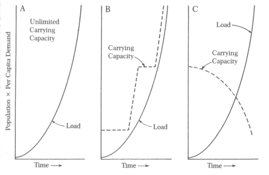 numerous and more colossal. The logistic model hardly applies to all populations. It assumes a constant carrying capacity. It could have applied to Americans if, after European colonization of the North American continent began, the technology used by these new inhabitants had not continued to advance. Then the merely geographic increment of carrying capacity would have produced an expansion of population to fill the newly available but fixed number of niches. At first the expansion would have shown an accelerating pattern. The Age of Exuberance was a manifestation of that pattern, a response to the unexploited niches then available in a New World. Eventually the pattern would have changed to decelerating growth as the ceiling was approached. Technology did not remain static, however. Recognizing that the technological change that has turned Homo Sapiens into Homo Colossus enable us to consume exhaustible resources at escalating per capita rates, and enables us to take over for ecologically unproductive uses land that might otherwise have provided sustenance in the form of renewable resources, Panel B shows carrying capacity being reduced as population expanded in the age of exuberance. [Colossus: originally the gigantic statue of Apollo at the entrance of the harbor of Rhodes; hence, any gigantic person or thing; in this book, a human being equipped with tools or apparatus that greatly enlarge the resource demands and environmental impact of that organism.] The future portion of Panel B depicts what supposedly might happen if, as is advocated by those who have become just enough ecologically aware to sound the alarm, the nations of the world succeed in halting growth very soon. So sharp a turn in the trend curve —from still-accelerating "progress" to a "steady state society" almost overnight— would inevitably be one of the most socially traumatic experiences in American history. Accordingly, these persons who oppose the "steady state society" idea insist that such a transition would be intolerable; many of them also insist that it is not necessary. But even the advocates of such a revolutionary curbing of aspiration tend to assume that the line between past and future occurs at a point in time where growth has not yet overshot carrying capacity. If overshoot has already occurred (or must occur because of demographic and technological momentum already generated), then the model depicted in Panel B is already obsolete, whether or not such a transition to equilibrium might once have been feasible. Resistance to abrupt change of deeply ingrained habits, expectations, and institutional forms and processes probably means the curve could not be voluntarily ( or democratically) bent toward the horizontal as sharply as shown in Panel B anyway. Sociocultural (and economic) momentum would tend to make Panel C more realistic. That is, the growth curve will continue upward, even as more and more people begin to sense something like a decline in carrying capacity. Overshoot will occur, if it hasn't already. We may come to feel guilty about stealing from the future, but we will continue to do it. Overshoot will further aggravate the reduction of carrying capacity. Crash must follow. The greater the overshoot, the greater the crash. After human population has crashed, resource species population could again grow faster than they would be consumed. Thus, in Panel C, the carrying capacity curve is shown bottoming out and starting to recover as a result of human population crash. Another cycle of human increase follows. This lynx-like recovery would be possible if carrying capacity were entirely or even mainly determined by renewable resources —i.e., if Homo Sapiens were still a consumer of organic products entirely derived from other (rabbit-like) living components of the biotic community. This is manifestly not the case. Hence, in Pane D, "carrying capacity" has been represented by two different curves. A major fraction of the recent, apparently high carrying capacity for human high-energy living must be attributed to temporary resources —i.e., non-renewable fossil acreage, the earth's savings deposits. In Panel D, it is optimistically assumed that the component of carrying capacity based on renewable resources has remained stable so far. But it is recognized that serious overshoot, induced by temporarily high composite carrying capacity, will at least temporarily undermine even the sustainable component. "Energy plantations" for example (one of the Cargoist3 proposal's), will tend to aggravate the competitive relation between our fuel-burning prosthetic machinery and ourselves; land taken over to feed technology will not feed humans. So "temporary carrying capacity" is shown actually dipping below the horizontal line for a while, before it recovers and becomes again simply "carrying capacity". The lesson from Panel D is that crash caused by the exhaustion of phantom carrying capacity by Homo Colossus could preclude a later cycle of regrowth. The boundary between past and future is drawn in Panel D, as in the other three panels, at a time when population appears not yet to have overshot carrying capacity. Whether or not that optimistic feature of the model is justified by current facts makes little difference if current practices have committed us to a trajectory that continues upward so that it is destined soon to cross the descending curve that represents global carrying capacity, a capacity not yet acknowledged to be finite. My own view, of course, is that the curves have already crossed. Either way, the past shown in Panel D more nearly accords with ecological history that do the pasts shown in Panels A, B, or C. The future hypothesized by Herman Kahn's think-tank group is dangerously optimistic because it is based on the least realistic past. But the pasts shown in Panels B and C are also less realistic than the past shown in Panel D. The futures shown in Panels B and C are therefore also p