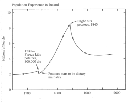 In 1739, Ireland was subjected to an unusual November freezing spell, which destroyed potatoes still in the field and already in storage. It has been estimated that 300,000 people died. But thenceforth, as the Irish became more and more committed to reliance on the potato, their numbers expanded (for a while at an accelerating pace) until they had passed the 8,000,000 mark by the census of 1841. In the top panel of Figure 2, I have plotted the Irish population curve, fitted to dots representing actual data. Population was still rising (probably through a kind of demographic momentum) when a fungus infection of potato plants reached Ireland in 1845. It turned potatoes into stinking, inedible, gooey globs. As the fungus organism (a competitor of Homo sapiens) took over the consumption of potatoes, the fungus irruption terminated the prior human irruption. A people who had become so completely dependent on one type of resource, which now turned out to be a fallible resource, were living so precariously that a population crash was inevitable when that resource did indeed fail. Recent censuses have thus shown Ireland (both the Republic and Northern Ireland together) to be inhabited by only about half as many people as lived there just prior to the famine. One striking feature of the Irish experience is the fact that population was still increasing, and the rate of increase had barely begun to diminish, when crash began. The onset of crash was not heralded by any prior period of "equilibrium." For about four generations the potato had been an opportunity for the Irish, but it soon became a requirement. For modern prosthetic hunter-gatherer nations, fossil acreage has been similarly converted by exuberant growth (of both population and industry) from an abundance of opportunities into an indispensable requirement. Although in the Irish case we know what happened to population (it crashed, but this crash consisted partly of emigration rather than totally of die-off), we can only surmise the carrying capacity trend. It does seem certain that the 8,175,124 population figure for 1841 had exceeded what the sustainable carrying capacity of the land might have been even if potatoes had not been susceptible to blight. Sooner or later soil deterioration from excessive use would have taken a similar toll, though more gradually. Minds that think ecologically can penetrate beyond the idiosyncrasies of political history, such as the prolongation of feudal warfare in Ireland, and the chronic conflict between the Irish and the English, or between Protestants and Catholics. They can see from the lynx cycles or the Irish population experience the utter folly inherent in the American Petroleum Institute slogan, "A country that runs on oil can't afford to run short." The slogan becomes much truer if we delete its last two words! For any species—human, feline, or whatever—excessive dependence upon a non-constant resource base makes life precarious. Many former settlements in the American West surged into brief prosperity and then atrophied into ghost towns. Essentially the same process was at work there and in Ireland: people allowed themselves to become numerous and extremely dependent upon a single type of resource that could not remain always abundantly available. Among the ghost towns, of course, "crash" presumably consisted entirely of out-migration; as long as there were other niches in a national economy into which ex-boomtown folk could move, actual die-off was quite unnecessary. Half or more of the Irish crash consisted of emigration. For a world population that has overshot carrying capacity, however, emigration is not a feasible alternative to die-off.